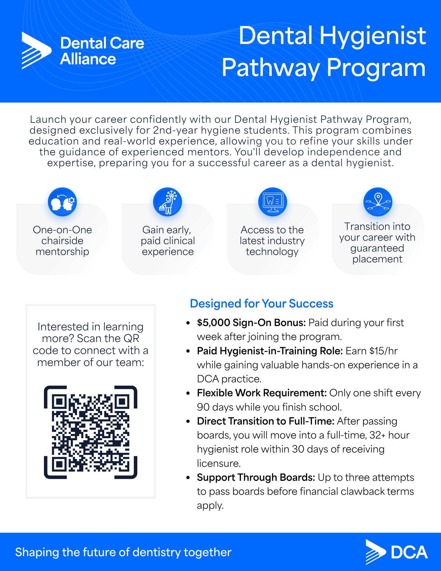 With a growing team of more than 1,000 dental hygienists, at DCA we pride ourselves on being the leading supporter of dental hygiene careers, offering unmatched resources, technology, and benefits to ensure you excel in your profession.